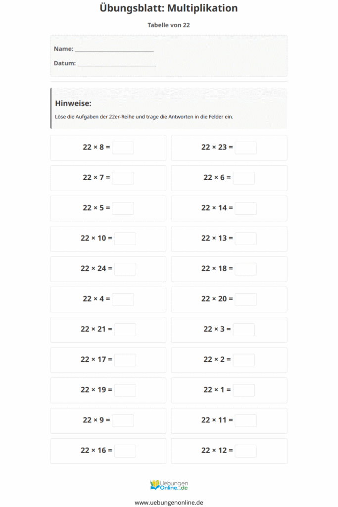Kostenlose Arbeitsblätter zur 22er Reihe enthalten unterschiedliche Übungsformate und eignen sich ideal für Schule und Zuhause.